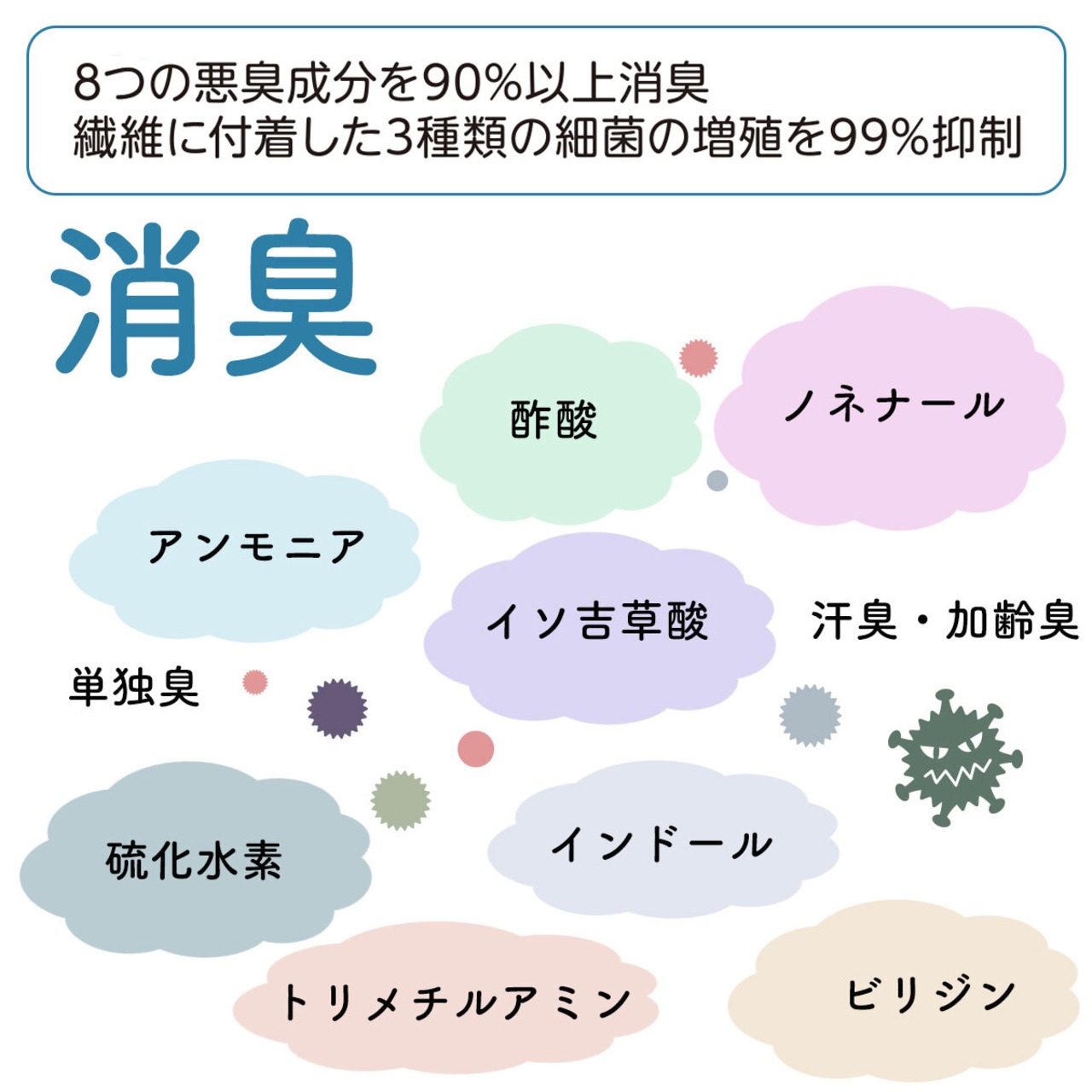 側生地の消臭ソムリエ生地は、汗の臭いや加齢臭を90%以上消臭する高性能な消臭・抗菌加工素材です。洗濯耐久性も優れています。尿や汗の臭い成分であるアンモニア、靴下や汗だくの脇の臭い成分であるイソ吉草酸、酸っぱい臭い成分である酢酸、中高年特有の臭い成分であるノネナールを吸着・中和します。抗菌効果も優れており、肺炎球菌、臭気の原因菌である黄色ブドウ球菌、部屋干し臭の原因菌の一つ、モラクセラ菌の増殖を維持上で99%以上抑制します。