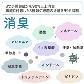 側生地の消臭ソムリエ生地は、汗の臭いや加齢臭を90%以上消臭する高性能な消臭・抗菌加工素材です。洗濯耐久性も優れています。尿や汗の臭い成分であるアンモニア、靴下や汗だくの脇の臭い成分であるイソ吉草酸、酸っぱい臭い成分である酢酸、中高年特有の臭い成分であるノネナールを吸着・中和します。抗菌効果も優れており、肺炎球菌、臭気の原因菌である黄色ブドウ球菌、部屋干し臭の原因菌の一つ、モラクセラ菌の増殖を維持上で99%以上抑制します。