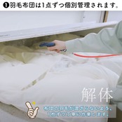 今までお使いの羽毛ふとんから羽毛を取り出し、他の羽毛と混ざらないように個別管理。羽毛を個別袋に入れ、皮脂や汚れをしっかり除去。ふんわり洗い上げます。