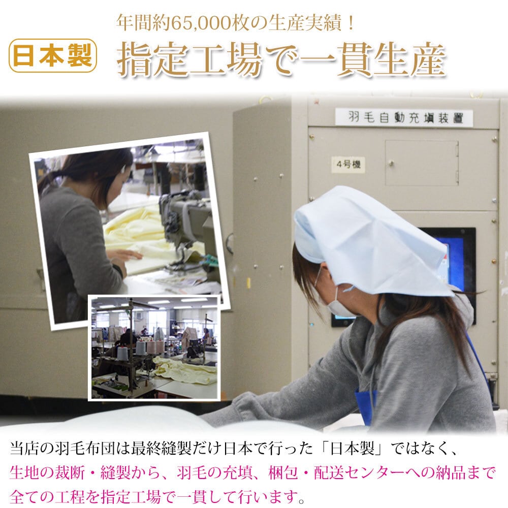 日本製。生地の裁断から羽毛の充填まで国工指定工場で一貫生産。ゴールドラベル、GFマーク付属。