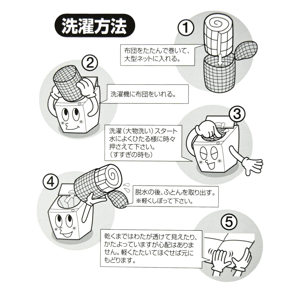 お布団は三つ折りや4つ折りにしてから丸めて筒状などにしてから洗濯ネットに入れ、大物洗い(水量を多く)モードで洗ってください。