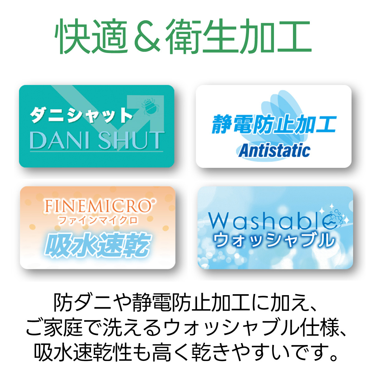 ダニを防ぐ「ダニシャット」、パチパチな静電気を防ぐ「静電防止機能」、ファインマイクロの「吸水速乾性」、さらにご家庭で洗える「ウォッシャブル仕様」。清潔にお使いいただける工夫が凝らされたお布団です。