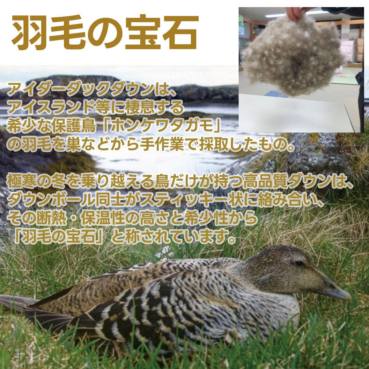 アイダーダックダウンはアイスランド等に棲息する希少な保護鳥「ホンケワタガモ」の羽毛を、巣などから手作業で採取したもの。