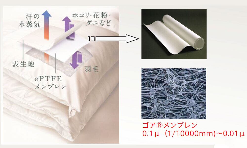 そこで、「長年使用しても清潔で衛生的」なメンブレン(ePTFEメンブレンというフィルム上の素材)加工を施した生地を採用しているのが「ゴア羽毛布団」です。